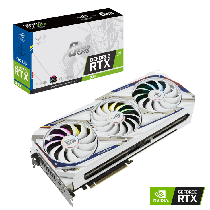 ASUS ROG Strix GeForce RTX 3080 GUNDAM EDITION được lấy cảm hứng từ series khoa học viễn tưởng được sản xuất bởi Sunrise, xoay quanh những người máy khổng lồ với tên gọi "Gundam". Sử dụng kiến trúc Ampare hoàn toàn mới cùng nhân RT thế hệ 2, nhân Tensor thế hệ 3, Nvidia RTX IO, VRAM GDDR6X và sản xuất trên tiến trình 8nm được Samsung làm riêng.